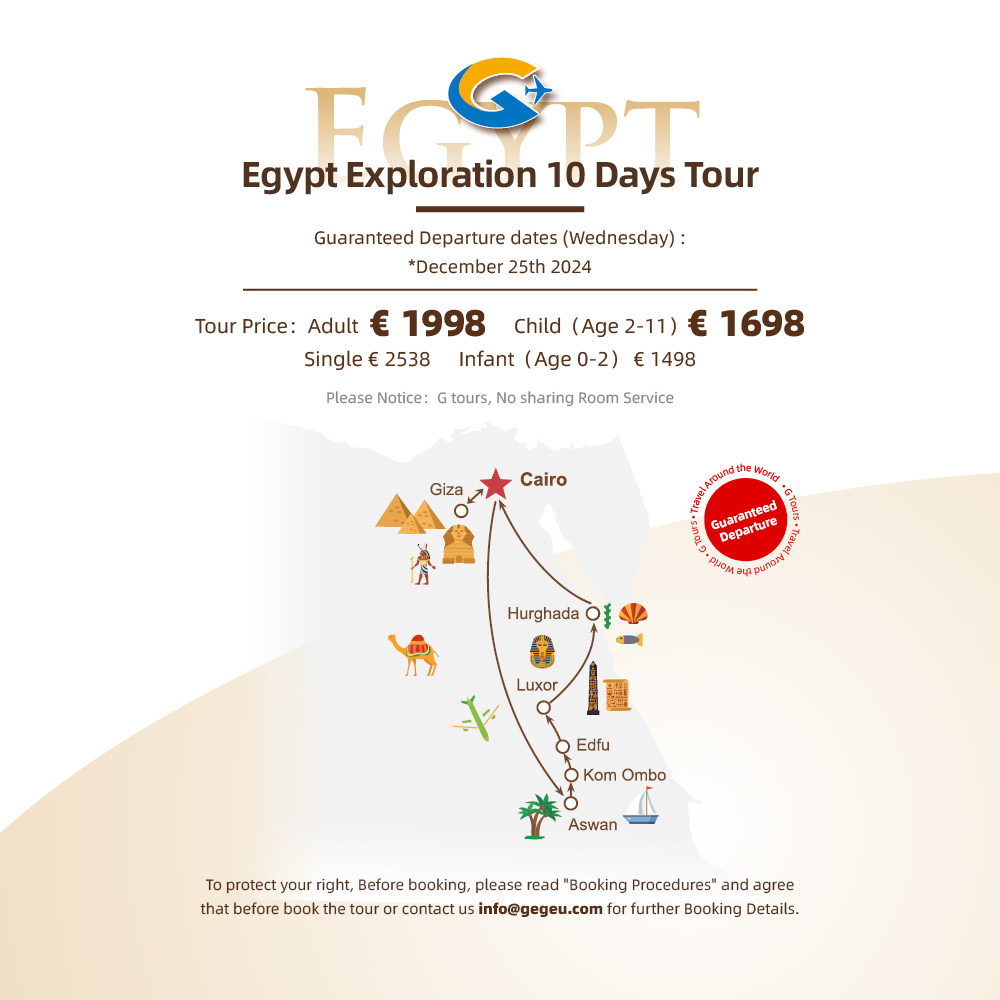 • Tour khám phá Ai Cập cổ đại và hiện đại 10 ngày: Tối thiểu 2 người, đảm bảo khởi hành. Phí tour bao gồm: 9 đêm nghỉ tại du thuyền và khách sạn 5 sao (du thuyền trên sông Nile 4 ngày + 2 đêm nghỉ tại khu nghỉ dưỡng ở khu vực Biển Đỏ + Khách sạn), Vé máy bay: Cairo – Aswan, ★Vé vào cửa các điểm tham quan, xe ngựa thành phố cổ Edfu, Chuyển đến và từ sân bay, Bữa ăn (trừ các ngày chuyển đến và từ sân bay)、2 chai nước mỗi ngày