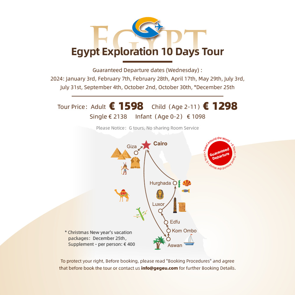 • Tour khám phá Ai Cập cổ đại và hiện đại 10 ngày: Tối thiểu 2 người, đảm bảo khởi hành. Phí tour bao gồm: 9 đêm lưu trú tại du thuyền và khách sạn 5 sao (du thuyền sông Nile 4 ngày + 2 đêm nghỉ tại khu nghỉ dưỡng ở khu vực Biển Đỏ + Khách sạn), Vé máy bay: Cairo – Aswan, ★Vé vào cổng các điểm tham quan, xe ngựa thành phố cổ Edfu, Chuyển đến và từ sân bay, Bữa ăn (trừ những ngày di chuyển đến và từ sân bay)、2 chai nước mỗi ngày.