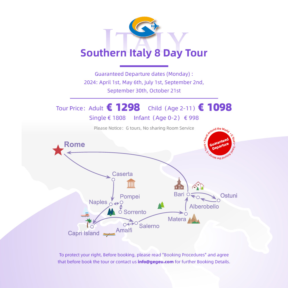 • Đường Hầm Thời Gian: Băng qua “Phong cách Nam Ý” 8 ngày: Giới hạn theo mùa từ tháng 4 đến tháng 10 hàng năm. Tối thiểu 2 người, đảm bảo khởi hành. Quà tặng miễn phí: Vé phà đến Đảo Capri! Dịch vụ chu đáo: Mỗi nhóm không quá 35 người! Tham quan: Bờ biển Amalfi, Đảo Capri, Thành phố cổ Pompeii, Matera, Alberobello, Ostuni, Caserta, Naples. Phí tham quan bao gồm: Vé phà khứ hồi đến Đảo Capri, 7 đêm tại khách sạn ba-bốn sao với bữa sáng kiểu lục địa, các chuyến tham quan thắng cảnh.