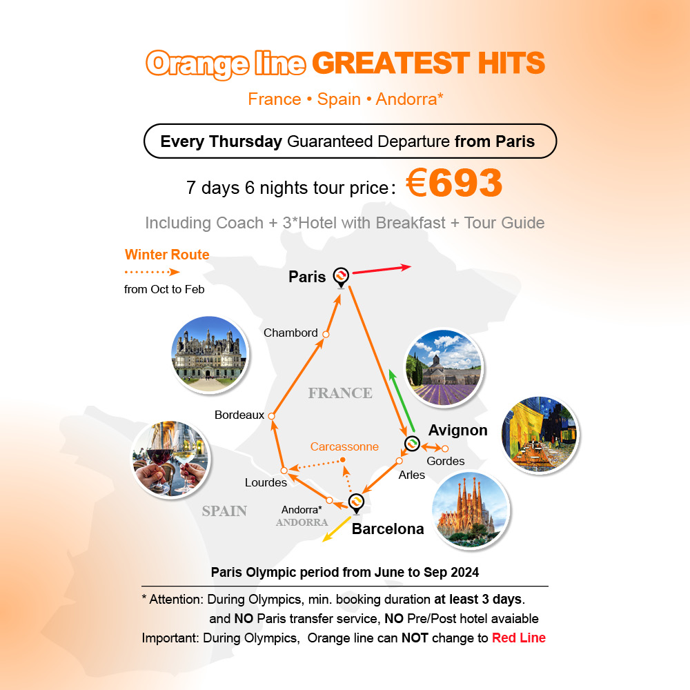 (Xin lưu ý: Từ tháng Mười đến cuối tháng Hai do thời tiết mùa đông, chúng tôi sẽ không đến Andorra và điều hướng đến Carcassonne ở Pháp. Carcassonne là một thành phố di sản thế giới với lâu đài đặc trưng của Carcassonne. Có 3 km tường thành kép và 52 tháp trong thành phố)